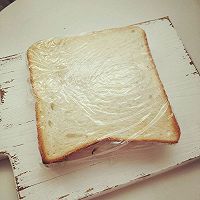 另一片吐司合上去,烤箱预热后,180°烘烤5分钟。取出来,冷却后,包上保鲜膜。