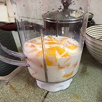 将大部分芒果块、蜂蜜、牛奶倒入搅拌机中打成泥