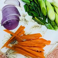 生姜,大蒜,萝卜丝,大蒜叶,洋葱切好备用