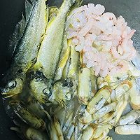 加入洗净的虾仁和煎好的小黄鱼大火烧开,转中火煮5分钟左右