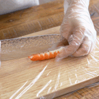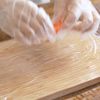 砧板上铺上保鲜膜,放上1片三文鱼,再铺一层保鲜膜,用擀面杖轻轻敲打至合适的厚度(大约2mm厚)