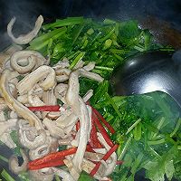 热油锅,下入香芹、香菜炒匀,再加入肚丝、红椒丝,同时加入料酒、酱油、白糖、盐、胡椒粉翻炒均匀(这道菜要大火快炒,不然芹菜火大嚼不烂)