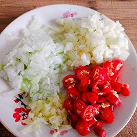 碗中放入葱姜蒜末,小米辣切碎