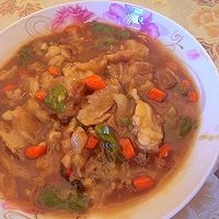 把辣椒蒜末放入锅里翻炒炒香以后放入牛蹄筋加入生抽,料酒花椒粉放入水淀粉等待汤汁变粘稠后倒入少许醋就完成了