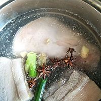 食材: 肘子一只、花椒少许、盐少许、冰糖适量、生抽少许、老抽一点、桂皮适量、大料适量、葱姜蒜适量、香叶适量、盐适量 步骤1: 肘子用大料葱姜蒜煮30分钟 步骤2: 煮好用绳子捆好 步骤3: 葱姜蒜,花椒大料,桂皮香叶老抽,生抽,盐,冰糖 步骤4: 放入适量水炖高压锅50分钟 步骤5: 出锅