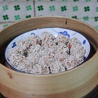 将挤好的肉丸子放在浸泡好的糯米上滚一下,均匀地粘上糯米粒