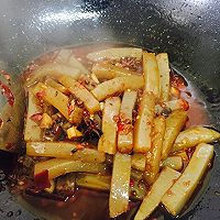 爆香所有辅料后,放下魔芋豆腐,油辣椒,生抽,香叶,小茴香,白砂糖,继续翻炒两三分钟,放入白糖,炒匀,加入少许汤,煮三五分钟即可,鸡精提味,加入葱段,关火,准备起锅。