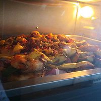 烤盘刷一层黄油面饼均匀的铺在烤盘上用叉子扎空去气。刷上黑椒酱铺上时蔬鲜虾芝士最后撒黑椒和马郁兰。