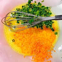 鸡蛋打散后,加入胡萝卜和香葱,少许盐。