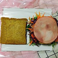 土司两片、豆苗适量、紫甘蓝适量、胡萝卜适量、生菜适量、火腿两片、芝士两片、生菜适量、鸡蛋三个、胡萝卜适量、香葱适量、沙拉酱适量