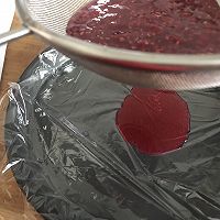 将一个平盘模具上铺好保鲜膜,将混合好吉利丁的果蓉过筛,因为我用的是新鲜树莓打成的果蓉,需要滤掉树莓籽,如果买成品树莓果蓉,这步可以忽略。将平盘放入冰箱冷冻室,冻硬后再来使用