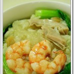5、然后将肉片下入汤中,搅散,煮熟后连汤倒入装有蔬菜的碗中;