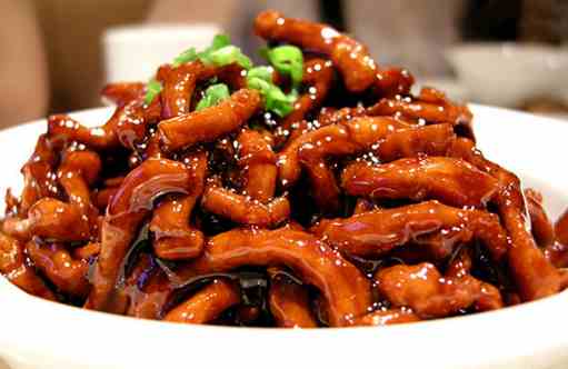 京酱肉丝是一道色香味俱全的汉族名菜,属于东北菜或北京菜。此菜咸甜适中,酱香浓郁,风味独特。选用猪里脊肉为主料,辅以黄酱或甜面酱及其它调味品,用北方特有烹调技法“六爆”之一的“酱爆”烹制而成。食用时辅以葱丝、腐皮,口味咸甜适中,酱香浓郁,风味独特。
