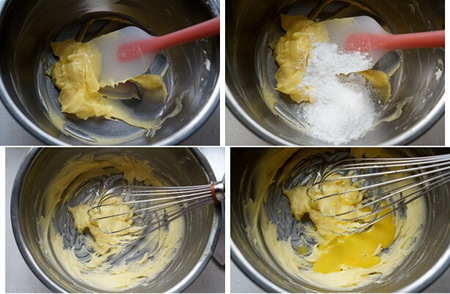 2、加入糖粉,先用刮刀拌匀,再用手动打蛋器搅打均匀;