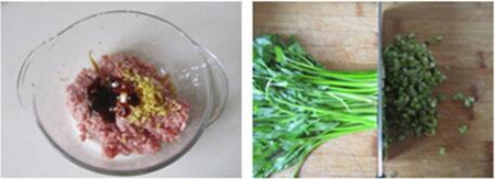 1.准备好春卷中的馅料:水芹菜冬笋和肉馅;