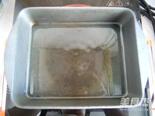 5.我用的小烤盘,放到电陶炉上开火,(用普通的平底勺一样操作。)烤盘涂上一层油