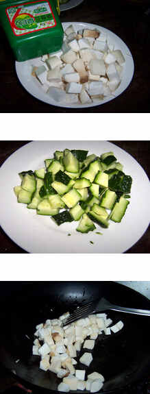 2.炒锅烧热,注入少量的油,下入胡萝卜丁翻炒后再下杏鲍菇丁煸炒,煸炒至杏鲍菇微黄后倒出。