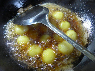 红烧小土豆用料工具 主料: 小土豆 (400克) 调料: 香葱 (适量) 生抽 (适量) 白糖 (适量) 盐 (适量) 味精 (适量) 厨具: 炒锅 红烧小土豆的做法: 1.食材:小土豆(已煮熟)、葱段 2.将已煮熟的小土豆剥去皮。 3.烧锅倒油烧热,下入剥好的的小土豆翻炒一下。 4.随后,加入一些清水煮开。 5.接着,加适量的生抽。 6.加适量的白糖。 7.加适量的盐。 8.调味煮开。 9.然后,煮至汤汁快要收干时,加适量的味精。 10.调味炒匀。 11.最后,搁入香葱,即可。 以上就是做菜网为大家带来的红烧小土豆的家常做法,如果想看更多关于红烧小土豆的做菜菜谱大全,请关注做菜网。