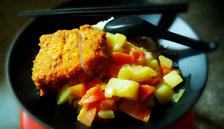 第一次试做,成品自我感觉还是不错的!材料数量为四人份的总和 日式咖喱猪排饭用料工具 主料: 猪扒肉 (500G) 胡萝卜 (一根) 大土豆 (一个) 大洋葱 (半个) 调料: 咖喱块 (4块) 鸡蛋 (一个) 面包糠 (适量) 盐 (适量) 黑胡椒粉 (适量) 面粉 (少许) 厨具: 不粘锅、炒锅 日式咖喱猪排饭的做法: 1.猪排分成四份,鸡蛋打散,土豆胡萝卜切块蒸熟,洋葱切丁下油锅微炒。然后下蒸熟的胡萝卜和土豆,加适量水。水开后加咖喱块,熬制5-10分钟至咖喱块完全融化后即可。 2.猪排用刀背锤松软,撒上盐和黑胡椒腌半小时以上。然后撒上薄面粉,裹上鸡蛋,再均匀且厚的裹上面包糠。 3.油锅烧热后,中小火下猪排煎炸,至两面金黄后即可 4.炸好的猪排立即切块 5.碗里装好饭,淋上咖喱汁,再放好切块的猪排,完成