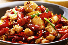辣子鸡丁,汉族特色菜肴,属川菜系,是四川川东一道著名的江湖风味菜,因缘于歌乐山而故名。干辣椒不是主料胜似主料,充分体现了江湖厨师“下手重”的特点。经巴国布衣厨师精心改良后其口味更富有特色,成菜色泽棕红油亮,质地酥软,麻辣味浓。咸鲜醇香,略带回甜,是一款食者啖之难忘的美味佳肴。